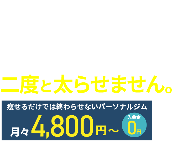 大手チェーンのジムとは違い、本物のプロだけが指導するプログラムですので、短期間で「太りにくい身体」を実現します。 また、無理のない食事コントロールや充実したアフターケアでリバウンドも怖くありません。
